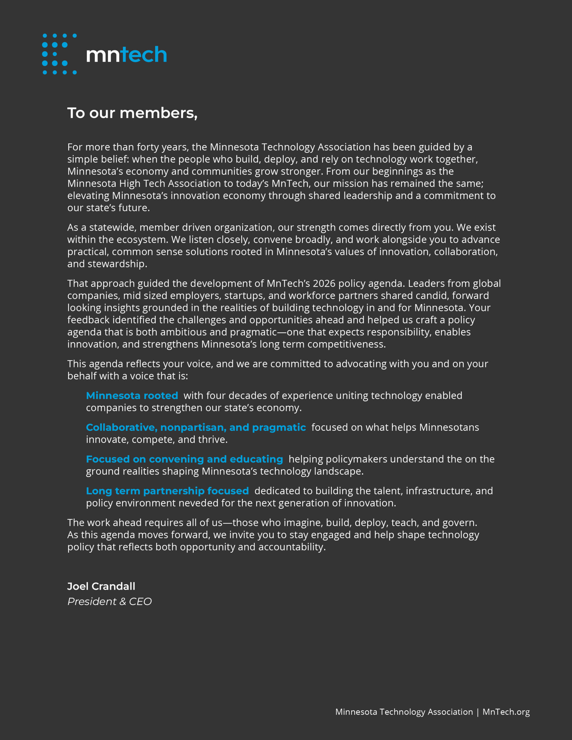 The 2026 policy agenda reflects the collective voice of Minnesota’s technology ecosystem. Developed with direct input from leaders across global enterprises, growing companies, startups, and workforce partners, it is grounded in real-world experience and focused on what will keep Minnesota competitive for the long term.