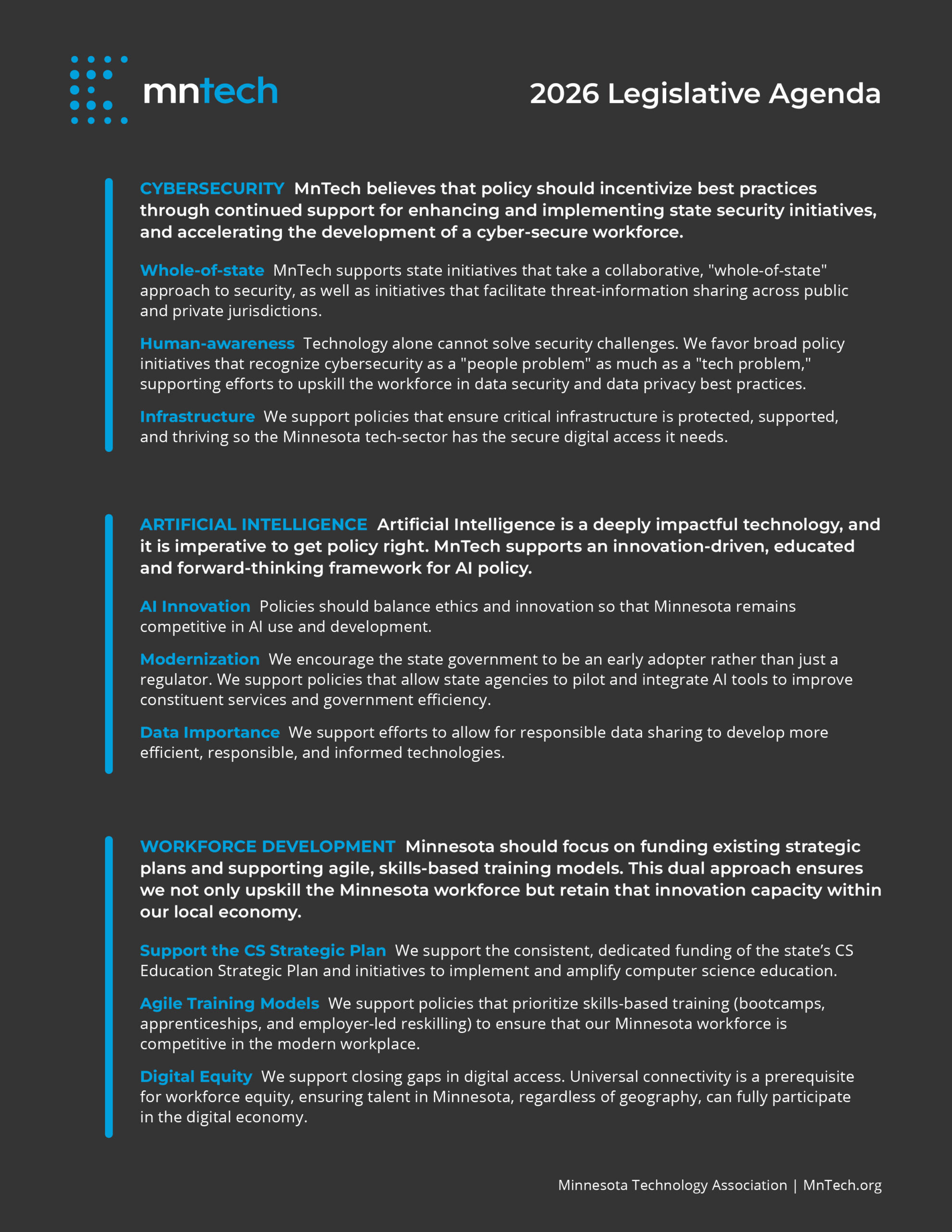 MnTech advocates for pragmatic, nonpartisan policies that enable innovation, strengthen talent and infrastructure, and help policymakers understand the realities of building and deploying technology in Minnesota. This agenda emphasizes shared responsibility, informed collaboration, and sustained investment in the systems that support innovation today—and for the next generation.